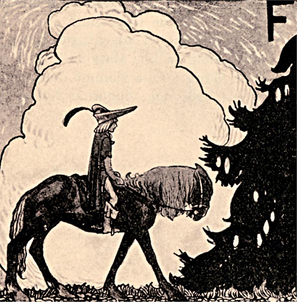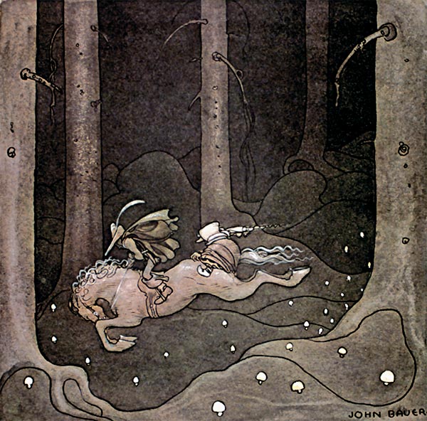 Так скакали они всё дальше и дальше. И вот диво – Петер Ларс заметил, что поводья натягивались словно сами по себе. Конь мчался, не разбирая дороги, напрямик сквозь кусты, с лёгкостью перепрыгивая через огромные кривые корни. Он перескакивал через пригорки и обрывы, и всякий раз, когда Петер Ларс оглядывался, ему чудилось, будто кто-то сидит у него за спиной.