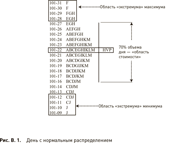 «Профиль», как его называют, показывает цену с наибольшим объемом, или сокращенно HVP (high volume price). Это та цена, которая появлялась в течение торгового дня дольше всего. На рис. В. 1 HVP находится на 101–22, или 101 и 22/32 (облигации и векселя, для которых была разработана эта система, торгуются с шагом цены в 1/32). Горизонтальная линия в конце распределения букв указывает, что эти цены являются частью области стоимости – она включает в себя 70 % всех сделок дня, представляя собой, грубо говоря, одно стандартное отклонение для тех, кто, может быть, знает математику (я, кстати, к их числу не отношусь). Область стоимости на рис. В. 1 находится в диапазоне от 101–16 до 101–27.