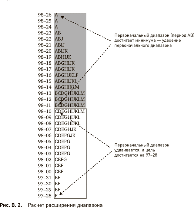 Например, на рис. В. 2 первый час, т. е. первоначальный диапазон, торгов в течение периодов A и B, имеет диапазон 16/32. Когда во время периода C первоначальный диапазон пробивается в нижнюю сторону, то, согласно правилу расширения диапазона, рынок должен пройти на величину, равную первоначальному диапазону 16/32.