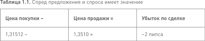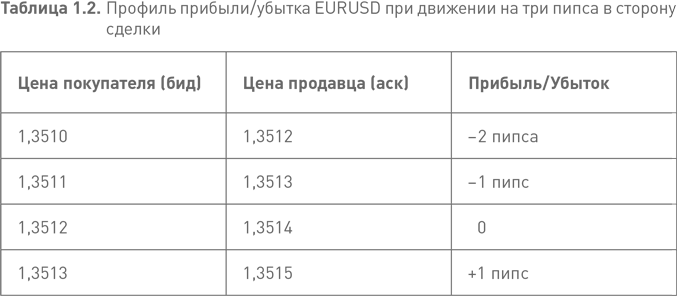 Тогда предположим, что если для получения прибыли требуется движение на три пипса в направлении сделки, то и трейдер согласен на такое же движение в три пипса в направлении, противоположном сделке, прежде чем закроет позицию по стопу. Поскольку в ценах валютных пар существует спред между предложением и спросом, трейдерам приходится покупать по цене, предложенной покупателем, и продавать по цене, запрошенной продавцом. Движение в три пипса в противоположном направлении создаст профиль убытка, показанный в табл. 1.3, при условии, что покупаем мы по цене 1,3512.