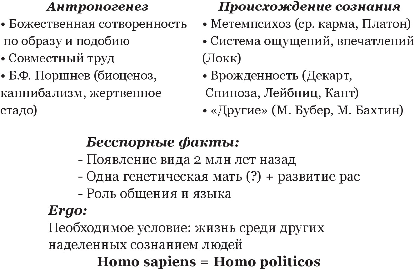 Существуют, однако, и взгляды, не связывающие формирование и развитие сознания с трудовой деятельностью, как, например, концепция отечественного психолога и историка Б.Ф. Поршнева, связывающая антропогенез с особенностями добывания пищи (биоценоза)17. Возникновение и развитие нового вида предполагают, что его представители должны есть то, чего не ел никто, то ли в силу труднодоступности (например, костный и головной мозг), то ли в силу других обстоятельств (например, каннибализм, затем – жертвенное стадо, выходцами из которого и были собственно пралюди). В этом случае язык возникает не в целях адекватной передачи мысли, а из стремления побудить ближнего к необходимым действиям и стремления избежать излишне тесных контактов с себе подобными. Этот подход также находит свое подтверждение в некоторых данных археологии, палеонтологии.