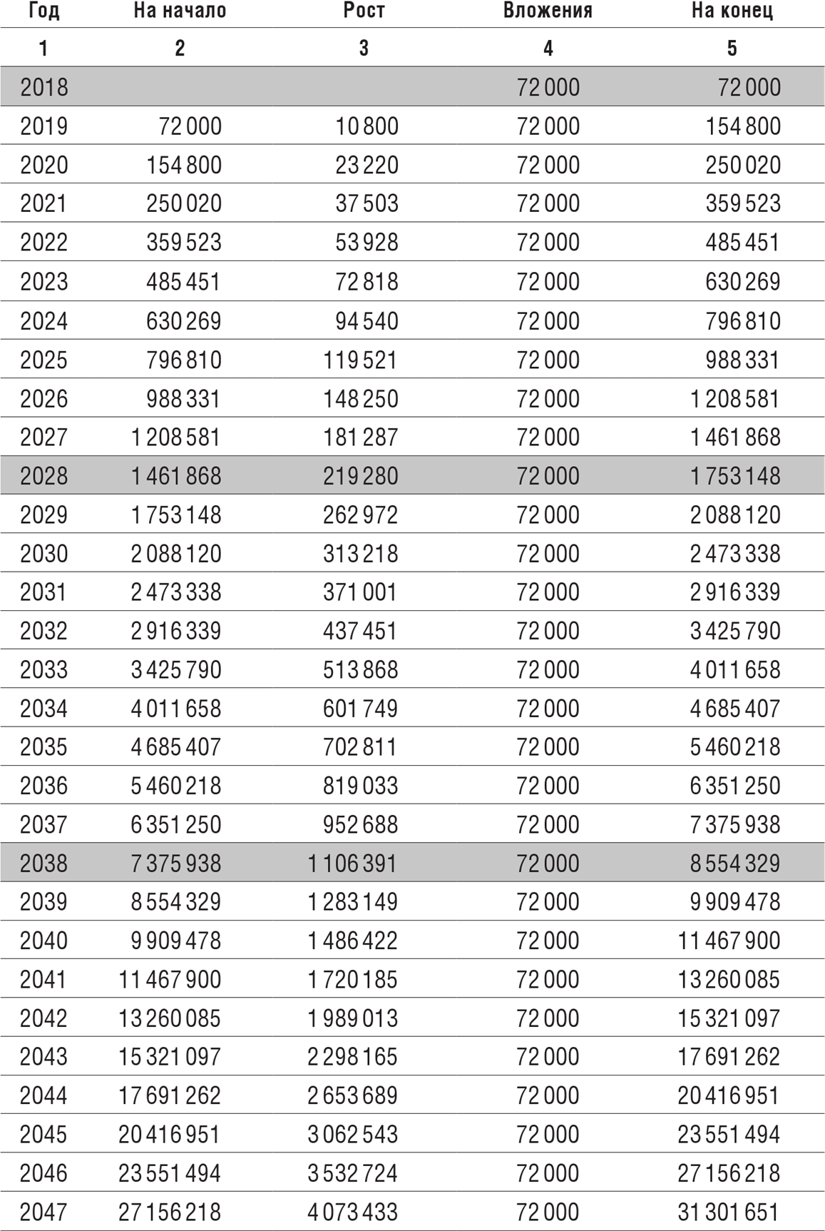 – Нет, не так. Здесь вы делаете две ошибки. Во-первых, вы переводите рубли в доллары по сегодняшнему курсу. К моменту вашего выхода на пенсию курс доллара, думаю, будет существенно выше сегодняшнего. Во-вторых, когда вы оцениваете размер вашего благосостояния через 40 лет, вы ориентируетесь на сегодняшние цены. Поверьте, через 40 лет цены будут совсем другими, и ваше благосостояние, скажем, в 100 миллионов рублей близко не будет напоминать благосостояние человека, который имеет сегодня 100 миллионов рублей. Но не будем забегать вперед. Давайте сначала рассчитаем, как получаются названные цифры. Вот табличка, которая показывает, что будет происходить, если каждый год вкладывать в собственный фонд накоплений 72 тысячи рублей и если прирост на них ежегодно будет составлять 15 % от накопленной суммы: