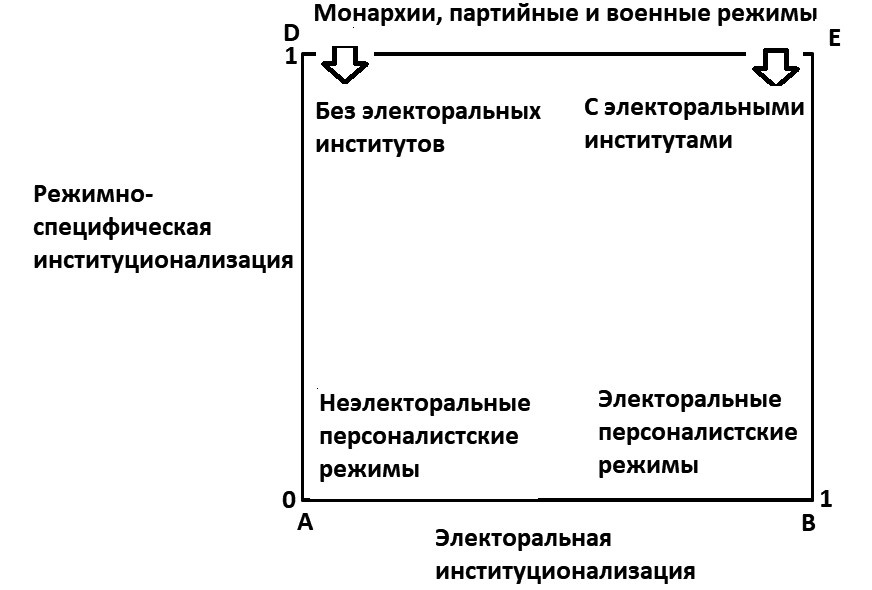 Схема 1 представляет собой простую двухмерную диаграмму. Ось AB представляет электоральную институционализацию, идущую от нуля для режимов, которые вообще не проводят выборы, до единицы для режимов, которые проводят многопартийные выборы на регулярной основе и используют их для формирования как своих законодательных, так и исполнительных органов власти. Ось AD представляет собой специфическую для режима институционализацию, идущую от нуля для режимов, в которых отсутствуют специфические для режима (неэлекторальные) механизмы приобретения власти и преемственности, до единицы для режимов, где такие механизмы выполняют эти задачи регулярно и без сбоев. Ни один из реальных авторитарных режимов не может быть расположен непосредственно на осях диаграммы. По определению все точки данных на осях являются идеальными точками. Однако некоторые из реально существующих режимов могут располагаться в непосредственной близости от осей, что делает такие случаи пригодными для иллюстрации.