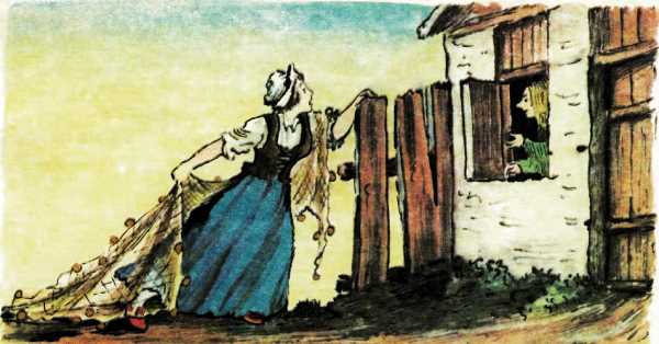 Побежал тогда Ганс домой. Принёс птицеловную сетку с маленькими бубенчиками и накинул сетку на Эльзу, а сам опять домой вернулся.