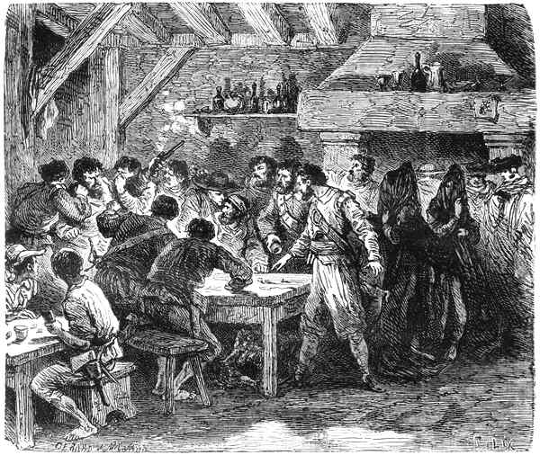 Все бросили игру и с любопытством толпились вокруг стола. Кто-то взобрался на скамьи, кто-то на столы и бочки, чтобы присутствовать при этой весьма необычной дуэли. Все затаили дыхание, дабы не нарушить тишины, до того глубокой, что полет мухи был бы слышен в зале, где находилось более двухсот человек.