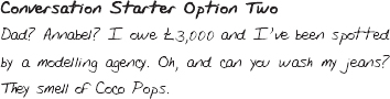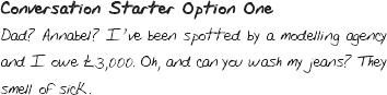 “Well, yes, my little Peach-melba. I could draw a picture, but Head Office thought that was ever so unfunny last time.” He giggles and pushes me away with a limp wrist. “Oh,” he adds casually. “I’m Wilbur, by the way. That’s bur not iam. From Infinity Models.”