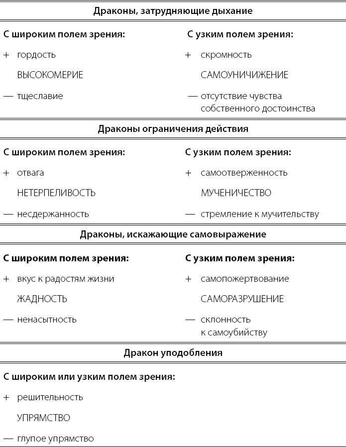 В обоих случаях орудием драконов является страх перед недостаточной мобильностью или ограниченной свободой действий. Вот почему нетерпеливость и мученичество называются драконами ограничения действий, как высокомерие и самоуничижение считаются драконами, затрудняющими дыхание.