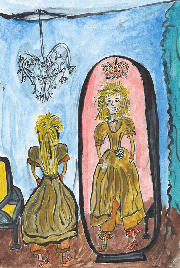 Девочка с распущенными волосами, которые ниспадали ей на плечи, как большой пучок рыжей соломы, сидела перед красным зеркалом и, рассматривая себя в нём, приговаривала: