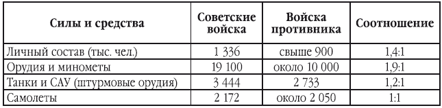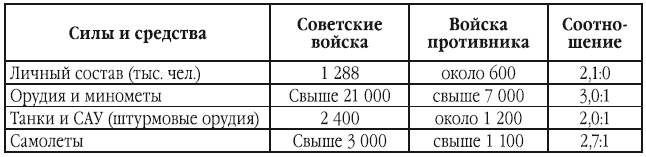 В ожесточенное столкновение, развернувшееся на довольно ограниченной территории, с обеих сторон были вовлечены огромные массы войск и военной техники: более 4 млн человек, почти 70 тыс. орудий и минометов, до 13 тыс. танков и самоходных артиллерийских установок (САУ), свыше 11 тыс. боевых самолетов.