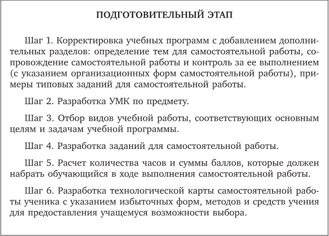 На подготовительном этапе задачами выступают моделирование и проектирование деятельности обучающегося и конструирование методических и программных материалов для организации самостоятельной работы.