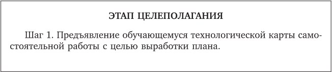Первый этап – этап целеполагания, в задачу которого входит совместное определение цели и составление технологической карты самостоятельной работы. Обучающийся знакомится с требованиями, предъявляемыми к изучаемому предмету в целом и к выполнению заданий по самостоятельной работе в частности, выбирает виды учебной работы.