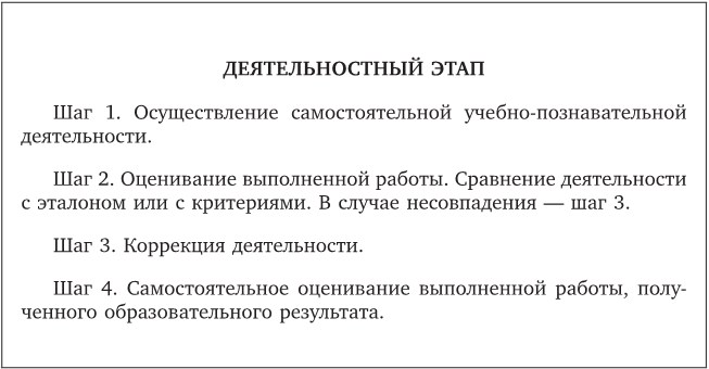 Четвертый этап – рефлексивный. Задача этого этапа – оценивание учебных достижений обучающегося и себя как субъекта учебно-познавательной деятельности. Рефлексию рекомендуется проводить на основе следующих вопросов: