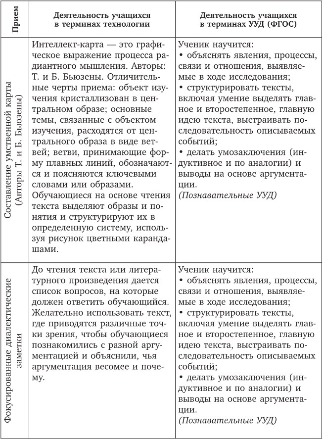 Матрица согласования приемов технологии и УУД для основной школы