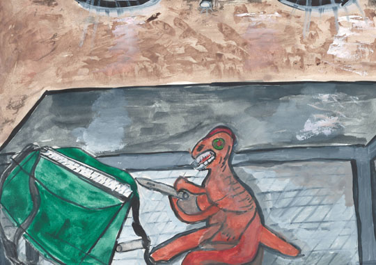 Рис 16. Гуппи проворнее ящерицы бросился к двери – Знака тоже нет, – ответила она и добавила, – я думаю, что эти детали не с корабля Клейма, даже на самых мизерных его деталях, стоит клеймо. Гуппи вдруг прервал разговор: – Жюль тебе пора! Уходи! Помоги мне и иди! – заторопил он девушку. Краснопланетянин проворно натянул пакет на голову, закрыв им и лицо, так как по-другому его невозможно было натянуть. – Сюда кто-то идёт! Будь осторожна! Жюль быстренько натянула пленку на пакет. Получилось очень правдоподобно, так как прилипшие к пленке волосы, создавали естественность. В тот же миг заработал прибор.