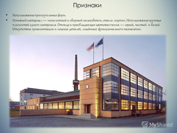 Бу услубда Ле Корбюзье, А. Аалто сингари кўпгина меъморлар ижод қилган. Функционализмга хос бўлган белгилар қуйидагилардан иборат: