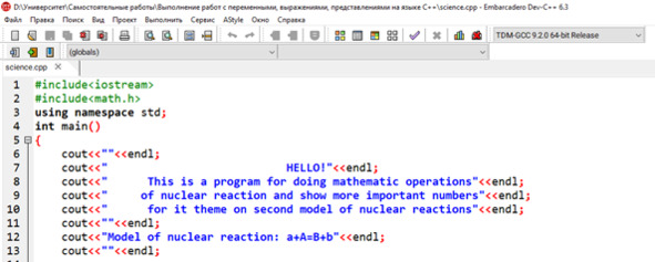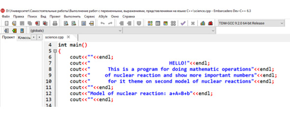 cout <<«»< cout <<" HELLO!»< cout <<" This is a program for doing mathematic operations»< cout <<" of nuclear reaction and show more important numbers»< cout <<" for it theme on second model of nuclear reactions»< cout <<«»< Как можно заметить из этого, изначально пропускается пустая строка для того, чтобы при повторном запуске программы, либо дальнейшем повторении (глава 5) не возникал коллапс. Изначально вставлено приветствие, при этом все текстовые значения выводятся посредством cout. Пробелы перед приветствием вставлены с целью расположения текста по центру относительно остальных значений. Далее в нижней находятся 3 строки текста. Итак, вторая из них состоит из 50 символов, при этом если вычесть 6 (число символов строки приветствия) получается 44, что даёт число пробелов от уровня начала второй строки, необходимое для расположения строки по центру, а именно 22. Первоначальные 5 пробелов во всех строках вставлены для добавления эффекта центрального расположения текста при выполнении программы. Этот момент представляется относительно (1) и (2) на Коде 1.1.2. Код 1.1.2. Центральное расположение текста в С++ cout <<«»< cout <<" HELLO!»< cout <<" This is a program for doing mathematic operations»< cout <<" of nuclear reaction and show more important numbers»< cout <<" for it theme on second model of nuclear reactions»< cout <<«»< Первая строка после приветствия, как и третья отлична от второй 2 знаками, по этой причине добавляется лишь 1 пробел перед ними. При написании первоначально, данного кода, можно наблюдать следующую картину (Рис. 1.1.1). Рис. 1.1.1. Запись в программе Dev-С++6.3 И в качестве отделяющего элемента приветствующего блока компьютерной программы и дальнейшего кода имеется пустая строка.