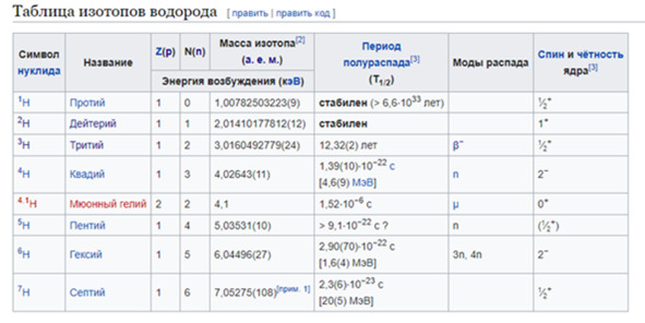 Рис 3.1.3. Примеры изотопов. Часть общей таблицы изотопов водорода