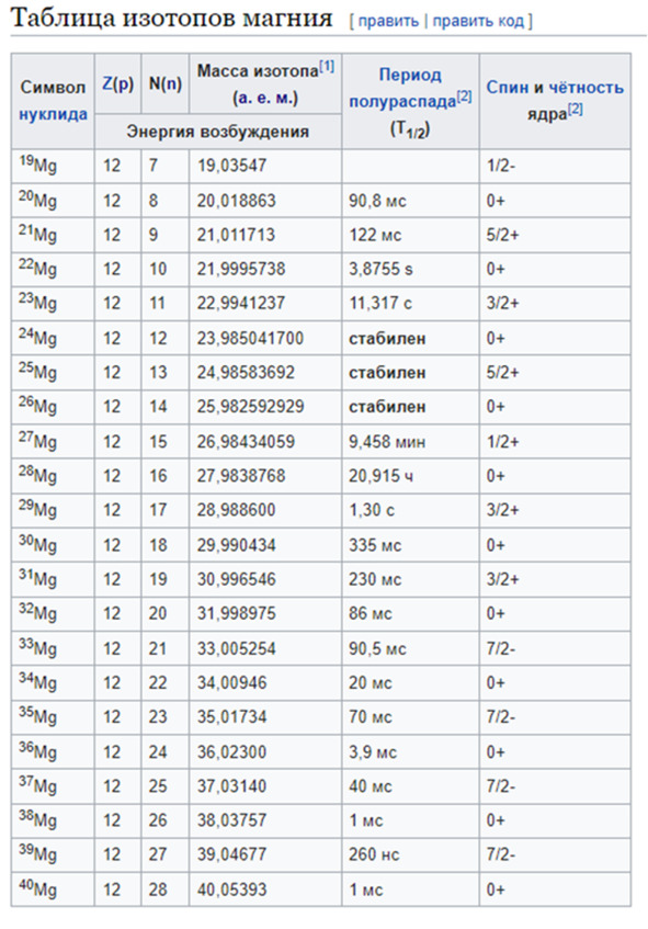 Рис 3.1.4. Примеры изотопов. Часть общей таблицы изотопов магния