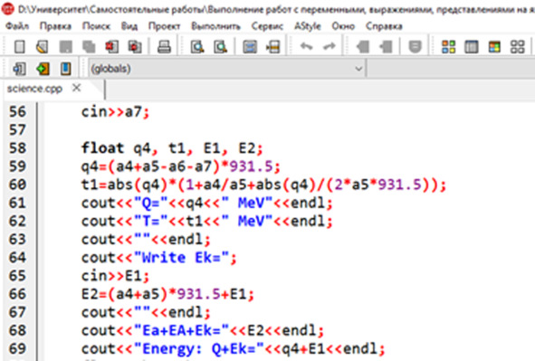 cout <<«Q="< cout <<«T="< cout <<«»< cout <<«Write Ek=»; cin>> E1; E2= (a4+a5) *931.5+E1; cout <<«»< cout <<«Ea+EA+Ek="< cout <<«Energy: Q+Ek="< В самой же программе этот код выглядит следующим образом (Рис. 3.5.1). Рисунок 3.5.1. Общий код в самой программе