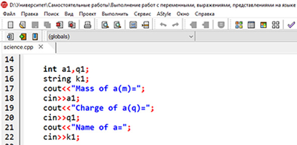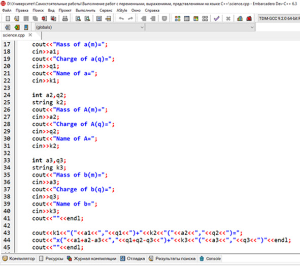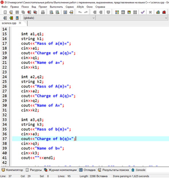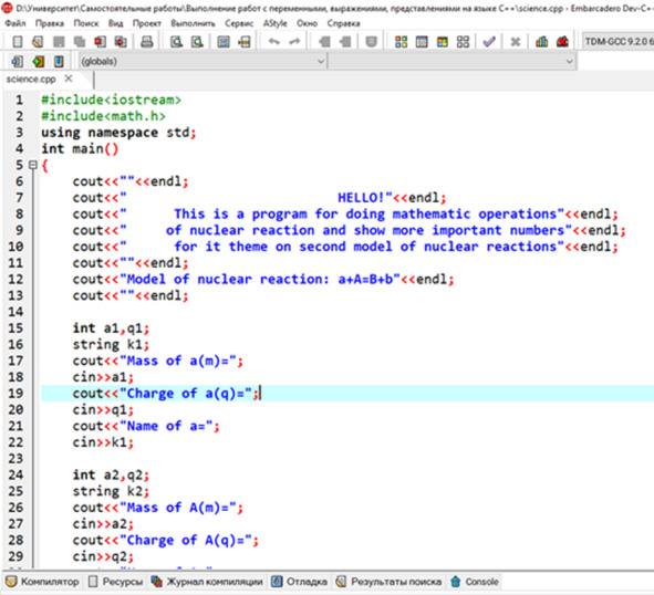 cout <<«ENERGY PART»< cout <<«Real mass of a (m) =»; cin>> a4; cout <<«Real mass of A (m) =»; cin>> a5; cout <<«Real mass of b (m) =»; cin>> a6; cout <<«Real mass of B (m) =»; cin>> a7; С учётом того, что при этом все данные вводятся в атомных единицах массы. После получения всех необходимых целочисленных данных, можно переходить уже к выполнению операций над полученными данными.
