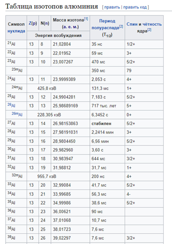 Рис. 3.1.1. Примеры изотопов. Часть общей таблицы изотопов алюминия