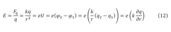 Электрическое поле подвластно своему измерению благодаря такому понятию как напряжённость (12), что характеризуется воздействием на поля определённого заряда на некотором расстоянии на зондовый заряд благодаря силе Кулона (11).