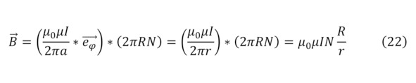 В данном случае, большую роль играет количество витков и с одной стороны, можно было бы сделать преобразование в (20), утвердив диаметр для спирали и учитывая все прошлые показатели для магнитной проницаемости, и протекающего тока (22), но эта закономерность будет не верной, поскольку в данном случае, образуется не прямолинейное, а именно вращательное электрическое поле, что создаёт непосредственно внутри соленоида прямое магнитное поле, приводя к верной формуле (21).