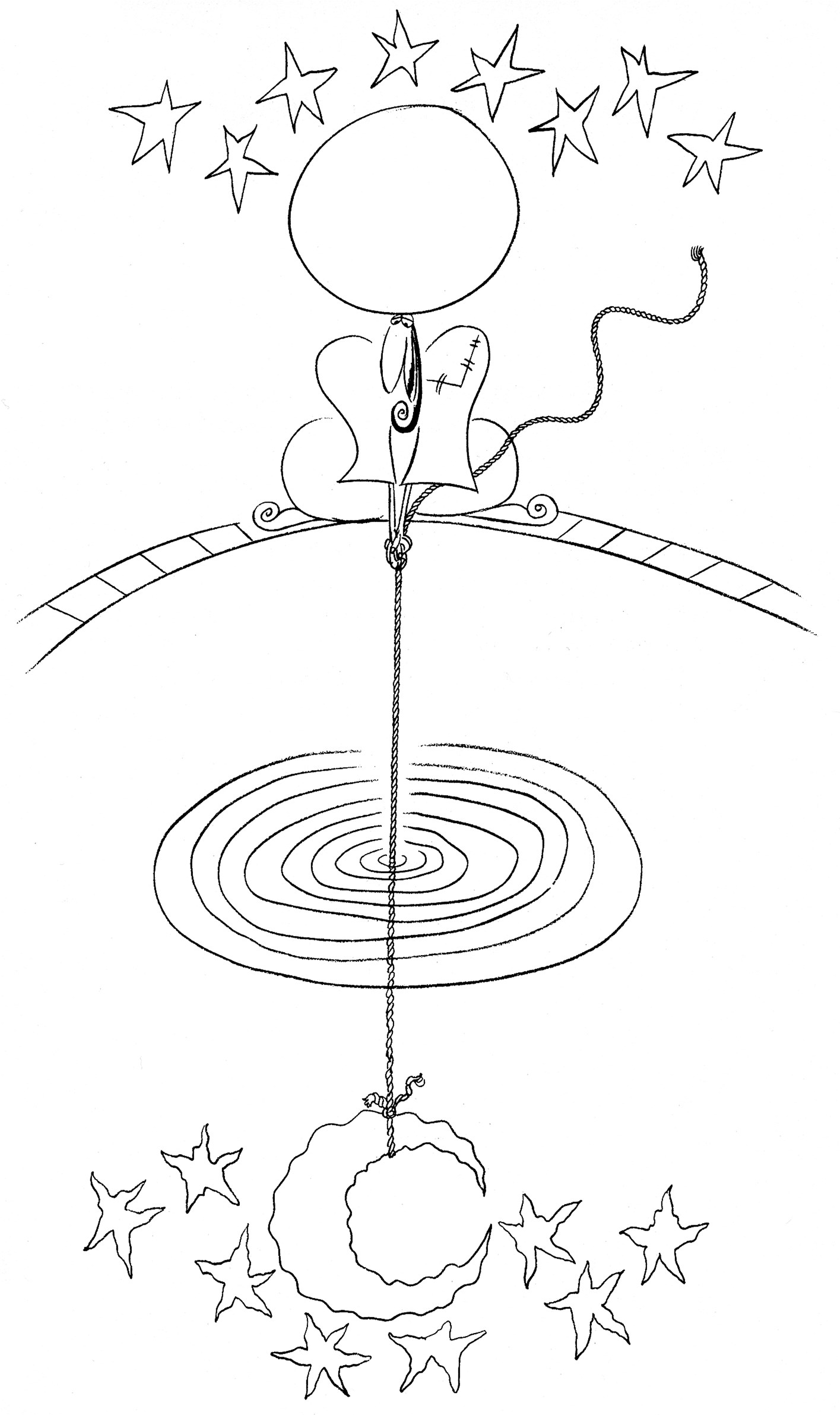 Веревка, упав в колодец, зацепилась за камень, и Насреддин, откинувшись назад, стал тянуть изо всех сил. Вдруг он почувствовал, что веревка ослабла, и упал на спину. Лежа на спине и тяжело дыша, он увидел луну, сияющую высоко в небе.