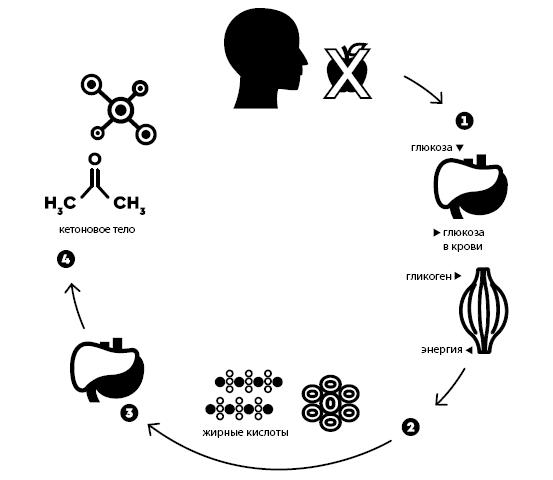 Во время голодания запасы гликогена в печени и мышцах расщепляются, и глюкоза выделяется в кровь. Как только эти запасы истощаются, организм переключается на использование жира. Жирные кислоты усваиваются печенью и используются для образования жировых телец, которые затем являются источником энергии, используемой клетками.