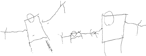 Следующая ситуация (рис. 2). Там мальчик стоит между мамой (слева) и папой (справа), все улыбаются, но… У них у всех нет рук. Я расценил это так, что ребенок чувствует нехватку внимания, ему необходимо больше тактильных ощущений, его необходимо обнимать и гладить. Надо любить сыновей и дочек в детстве, и когда они станут взрослыми, тоже будут любить своих детей.