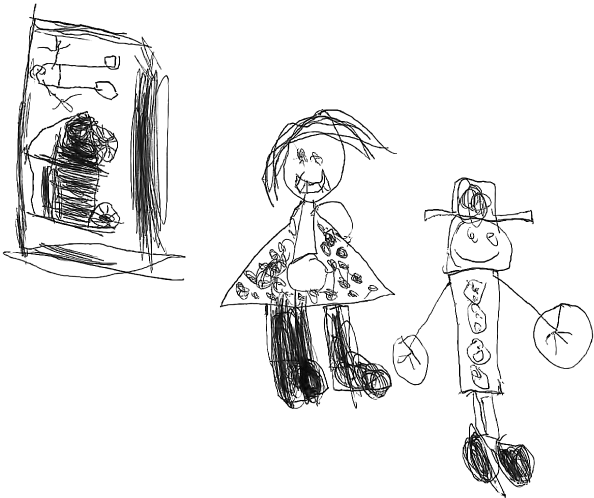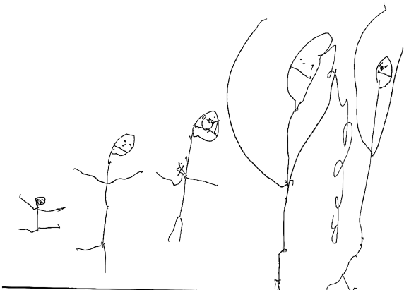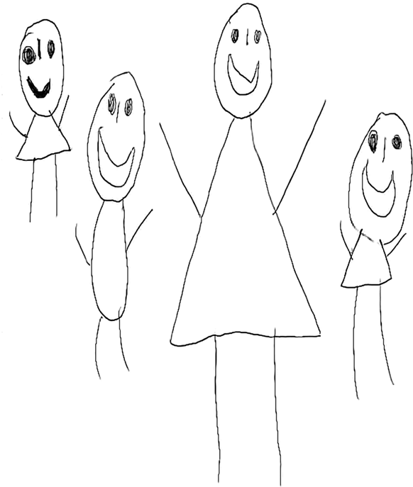 Я попросил ребенка нарисовать ее семью (рис. 24). Слева направо: девочка, папа, мама, сестра. Удивительно – малышка нарисовала разную длину конечностей! Возможно, я преувеличиваю и выдаю желаемое за действительное, но посмотрите…