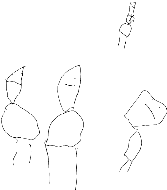 Я попросил малыша нарисовать его семью. Он это выполнял в зеркальном отображении – вверх ногами, головой вниз (что символично: в этой семье действительно все с ног на голову), этот рисунок я перевернул (рис. 17). На переднем плане слева направо: дедушка, бабушка, мама. Дед улыбается, бабушка улыбается шире, мама совсем не улыбается, а папы на рисунке нет. У всех нет рук и ушей. На заднем плане сам грустный мальчик.
