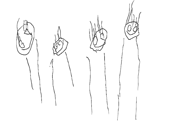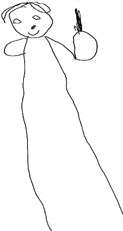 Малыш по моей просьбе нарисовал свою семью. Слева направо: пятимесячный брат, сам мальчик, мама, папа. Пациент хочет чувствовать себя самым младшим, даже пятимесячного брата он нарисовал больше себя. Или, возможно, он хочет напомнить, что он тоже маленький, и ему нужны тепло, забота, больше тактильных ощущений (ласковые прикосновения и объятья).