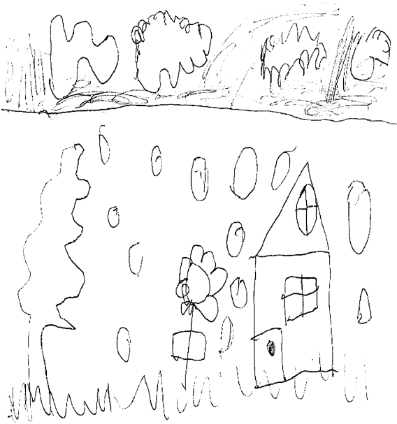 5-летний мальчик пришел на прием без особых жалоб со стороны матери, а я его просто, чтобы занять, попросил порисовать (рис. 25). Изображен дом, у него нет трубы с дымом (обычно трубу с дымом оценивают как очаг, уют), нет входа, нет ступенек или крылечка, есть дверь, но она закрыта, и в нее нельзя войти (что обычно означает замкнутость ребенка). Вверху тучи на темном небе, а по всему листу крупные овалы – это дождевые капли (рисунок был сделан в начале марта, когда еще лежал снег, и дождей не было).
