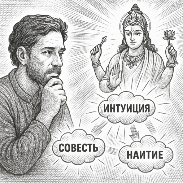 Эти три аспекта – интуиция, совесть и наитие – являются проявлением параматмы в нашей жизни, её тихим, но уверенным руководством, которое ведёт нас через жизненные испытания, предлагая мудрость и защиту, даже когда мы не понимаем этого.