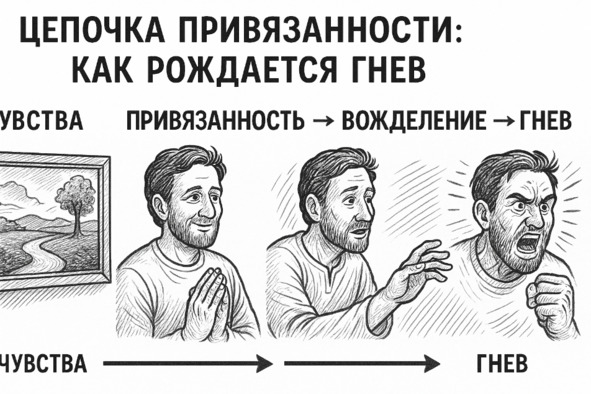 Созерцая объекты, приносящие наслаждение чувствам, человек развивает привязанность к ним. Из привязанности рождается вожделение, а из вожделения – гнев.