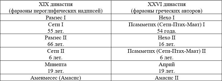В этом случае общая продолжительность правления Псамметиха I (Сети-Птах-Маата) и Нехо II (664 – 695 гг. = 69 лет) примерно соответствует общей продолжительности правления Сети I и Рамсеса II (66 или 68 лет).