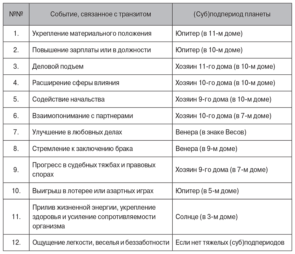 Однако материальное положение может заметно (так сказать, по-юпитериански) укрепиться, только если об этом говорит (суб)подпериод. В противном случае никаких серьезных перемен наблюдаться не будет. Повышение в должности также произойдет, если действует благоприятный ведический (суб)подпериод. Прилив энергии (п. 11) может означать как просто хорошее здоровье, так и быстрое выздоровление после болезни, случившейся в течение данного транзита Юпитера. То, какой вариант воплотится в жизнь, опять-таки зависит от текущего (суб)подпериода. Аналогичные замечания справедливы и для остальных перечисленных моментов. Вообще, трудно себе представить, чтобы за один транзит смог реализоваться весь список вероятных эпизодов. Как правило, это происходит избирательно и определяется (суб)подпериодом (табл. 1).