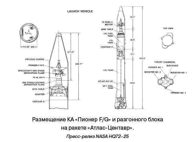 В январе 1970 г. старты «Викингов» были отложены с весны 1973-го на лето 1975 г. Как следствие, отпала необходимость в испытательном пуске ракеты «Титан-Центавр» в 1972 г.[14], и единственным носителем «Пионеров» остался «Атлас-Центавр» компании General Dynamics/Convair с дополнительным разгонным блоком TE-M-364–4. Фактически это была верхняя ступень от ракеты «Дельта» с твердотопливным двигателем тягой 6800 кгс от фирмы Thiokol Chemical Company. Эта комбинация обеспечивала для аппарата стартовой массой 258 кг при прямом выведении (без промежуточной опорной орбиты) отлетную скорость 14,5 км/с и достижение Юпитера через 600–750 суток.