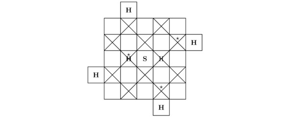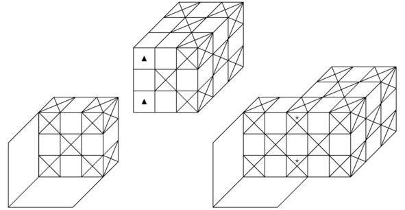 Итак, на чертеже 2.1 продемонстрированы 2 пары одиночных ионов, расположенных отдельно друг от друга на размещённом слева рисунке и скреплённых в общую химическую структуру на запечатлённом справа изображении. Далее рассмотрим материальные частицы, визуализированные на эскизе 2.2. Вне всякого сомнения, треугольники, сосредоточенные внутри первого бозона, лежат на одной прямой, вследствие чего в них легко попадают крестики (потенциальные ямы с электронами (в дальнейшем лептонами или фермиономи)) другого химического элемента. Таким образом, на иллюстрации 2.2 возможно увидеть более прочное соединение по сравнению с тем, что было показано на картинке 2.1.
