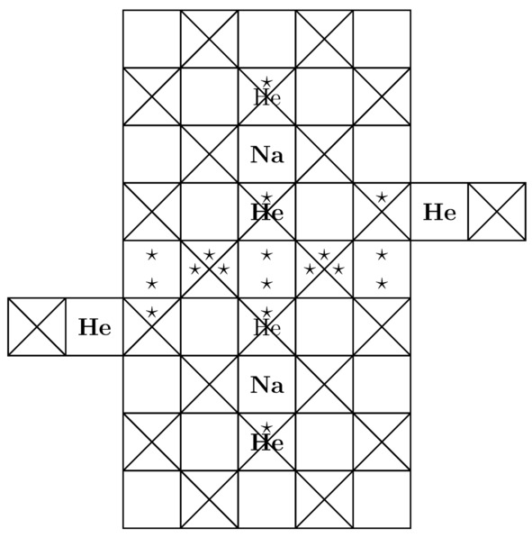 В этом параграфе мы рассмотрим металл Na2He, существующий под высоким давлением Pb≈113 ГПа. В дальнейшем на эскизах 3.1—6.2 жирным шрифтом будут обозначаться наименования закреплённых в узлах исследуемых химических соединений видимых ядер, а обычным – невидимых. Теперь отыщем сумму треугольников, сосредоточенных внутри каждого из нейтральных ионов гелия He0, тогда: