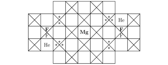 Итак, акцентируясь на особенностях строения материала CaF2He, смоделируем кристалл MgF2He. Естественно, что во всякой изолированной от внешнего воздействия экспериментальной камере в результате синтеза той или иной химической субстанции реагирующие между собой компоненты расположатся в пространстве потенциальных ям наиболее компактным образом друг относительно друга, не нарушив при этом законов симметрии. Бесспорно, рассматриваемое здесь вещество MgF2He не является исключением. Ниже мы построим лишь одну из модификаций моделируемой в настоящем примере кристаллической структуры MgF2He. Теперь определим общее количество треугольников Tr (Mg) для магния Mg без учёта свободно блуждающих электронов, следовательно: