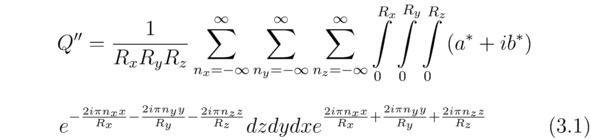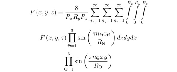 Естественно, что тригонометрический ряд (3*), полученный для совокупности абсолютно всех рациональных и иррациональных значений F (0,0,0),…,F (Rx, Ry, Rz), неравномерно распределённых на отрезках (kΔx, (k+1) Δx), (jΔy, (j+1) Δy) и (χΔz, (χ+1) Δz), примет следующий вид: