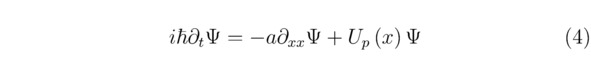 где M – масса электрона (в дальнейшем лептона или фермиона); T``` – период волны де Бройля; t – время; x – координата; Cn – амплитуда колебаний; ω` – угловая частота; Up (x) – потенциальная энергия.