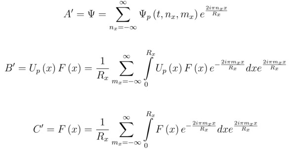 Итак, осуществляя поиск общего аналитического решения того или иного нестационарного линейного уравнения Шрёдингера Ψ, разложим в ряд Фурье каждое из следующих выражений: