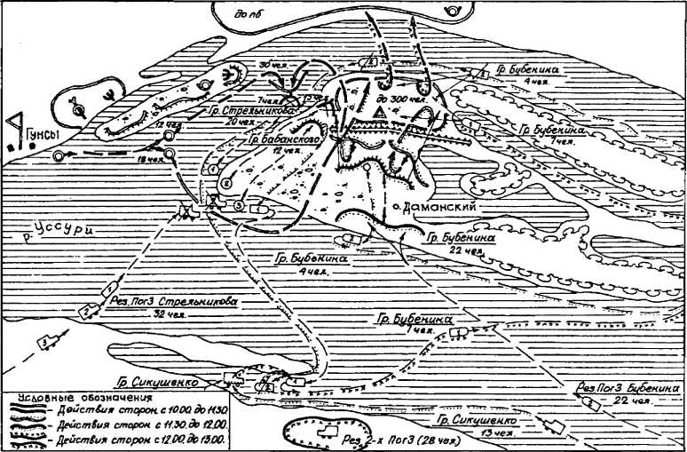 Не отставали и китайцы. К 7 марта группировка китайских войск также была значительно усилена. На даманском и киркинском направлениях сосредоточилось до пехотного полка, усиленного артиллерией, минометами, противотанковыми средствами. В 10–15 км от границы разворачивалось до 10 батарей дальнобойной артиллерии крупного калибра. К 15 марта на губеровском направлении было сосредоточено до батальона, на иманском – до пехотного полка с танками, на пантелеймоновском – до двух батальонов, на павло-федоровском – до батальона со средствами усиления. Таким образом, китайцы сосредоточили пехотную дивизию со средствами усиления.