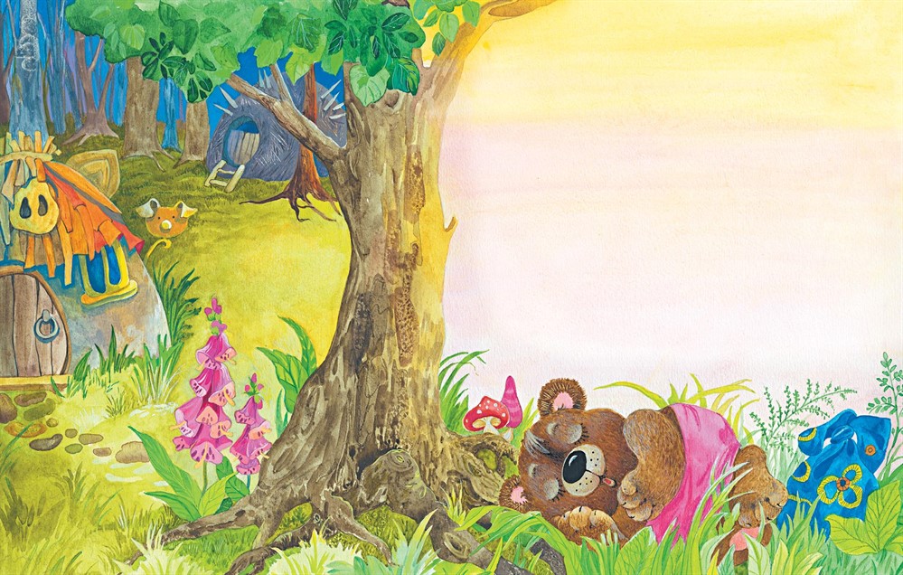 Медвежонок, чтобы встать пораньше, с первыми лучами солнца, решил не в берлоге спать, а прямо под открытым небом, в мягкой травке. Как только лучи солнца осветили его мордочку, он тут же вскочил, схватил приготовленный мамой мешочек с пирогами и мёдом и помчался будить Колючку и Хрю-хрю. Они встали, тоже взяли с собой котомочки с едой и договорились встретиться снова на родной опушке через день.