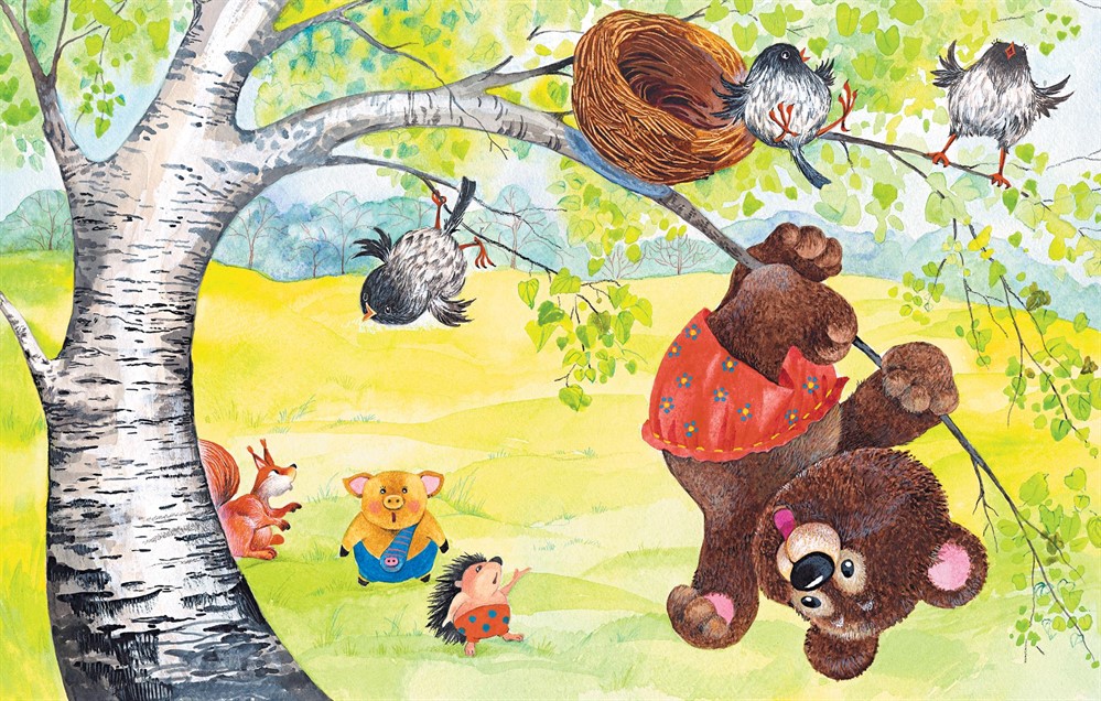 Однако Топтыжка не растерялся, изловчился и посадил птенца в гнездо. Потом выждал, пока дерево перестанет качаться, и попятился вниз. И тут произошло самое ужасное: ветка берёзы начала стремительно сгибаться всё сильнее и сильнее… Птенцы выскочили из гнезда, вцепившись в тонкие веточки коготками, а Топтыжка повис головой вниз, обхватив затрещавшую ветку всеми четырьмя лапами. Но при каждом новом его движении дерево продолжало зловеще трещать, как бы говоря: «Не двигайся! А то я сейчас сломаюсь, и все вы упадёте!»