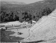 Гордость святилища – отлично сохранившийся большой театр на склоне холма с 34 рядами сидений, разделенных на секторы 12 лестницами. Полукруг орхестры ограничивает фундамент сцены, фланкированной с двух сторон симметричными двухпролетными арками парадных входов. Наравне с лечением молитвами Асклепию здесь практиковали врачи, лечившие гимнастикой, и устраивались театральные представления в честь бога врачевания.