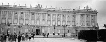 Строгий классически выдержанный фасад королевского дворца словно олицетворяет суровую испанскую монархию, некогда владевшую более чем половиной мира, зажатую в тесные рамки строжайшего двороцвого этикета и следующую советам церкви и инквизиции, не оставляющим никакого шанса малейшим вольностям и инакомыслию. Современный королевский дворец построен на месте арабского Алькасара, который сгорел (а по другой версии был подожжен по приказу короля, чтобы расчистить место для новой постройки) при Филиппе V, в начале 18 в. Дворец, возведенный архитекторами Сабатини, Санкетти и Вентурой-Родригесом был закончен в середине 18 в. Это трехэтажное барочное здание из серого мрамора с белыми пилястрами и декором окон, охватывающее обширный парадный двор, является одним из крупнейших королевских дворцов Европы. Этажи членены на вертикальные секции простыми пилястрами, между которыми расположены прямоугольные окна с чередующимися полукруглыми и треугольными фронтонами, крыша окружена балюстрадой со скульптурами. Такой скромный фасад создает резкий контраст между внешностью и содержанием, скрывающим пышные интерьеры дворца, украшенные сокровищами испанской короны.